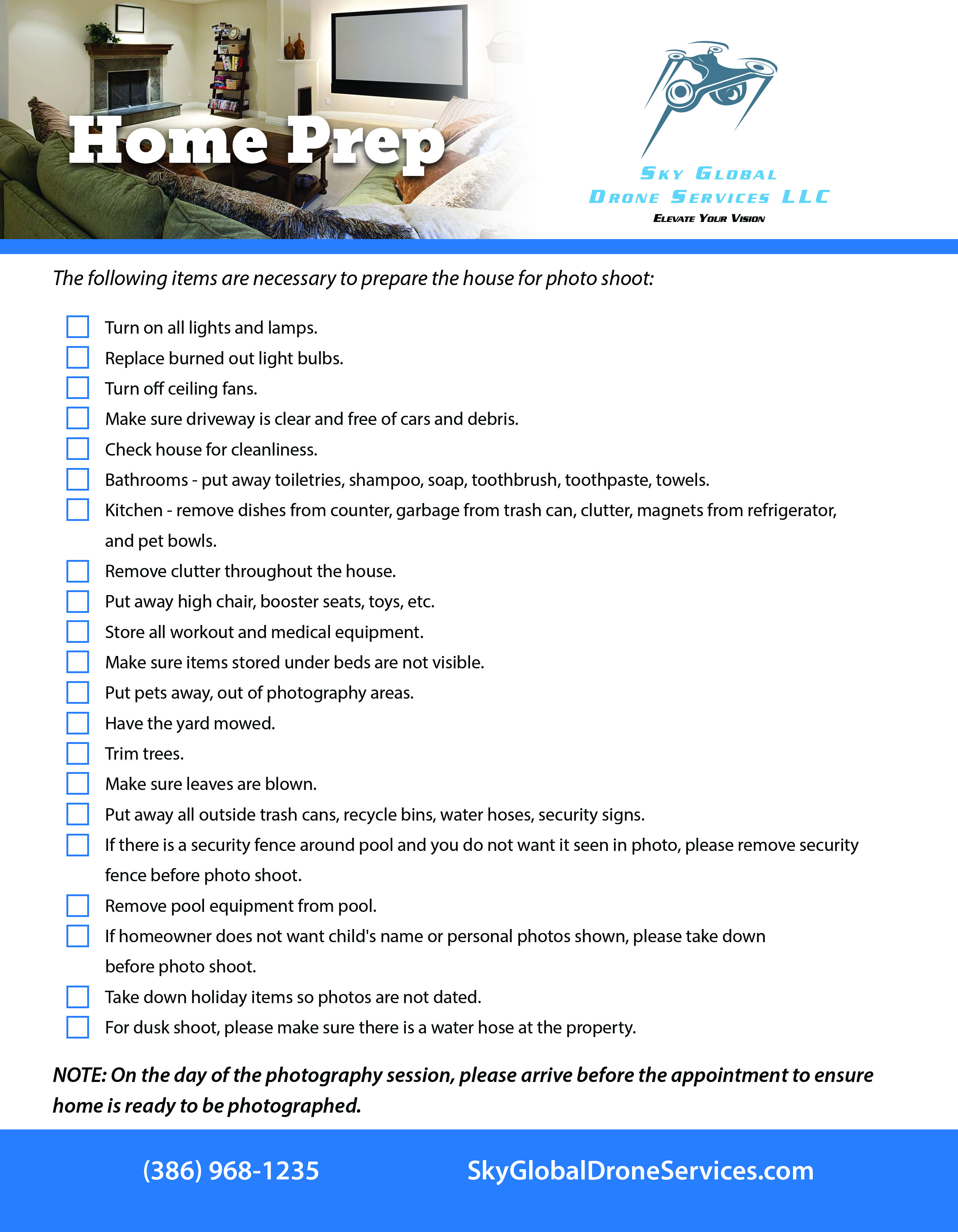 After setting an appointment with SkyGlobal Drone Services, please review the home preparation flyer to ensure your property is ready for the photo shoot. Here you will see all those requirements for photography